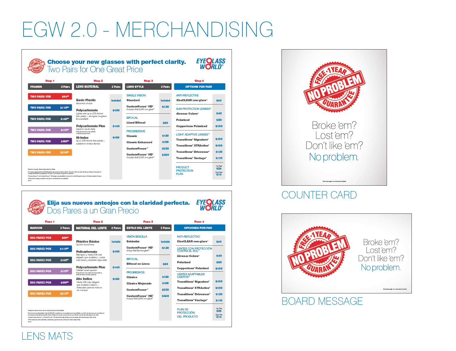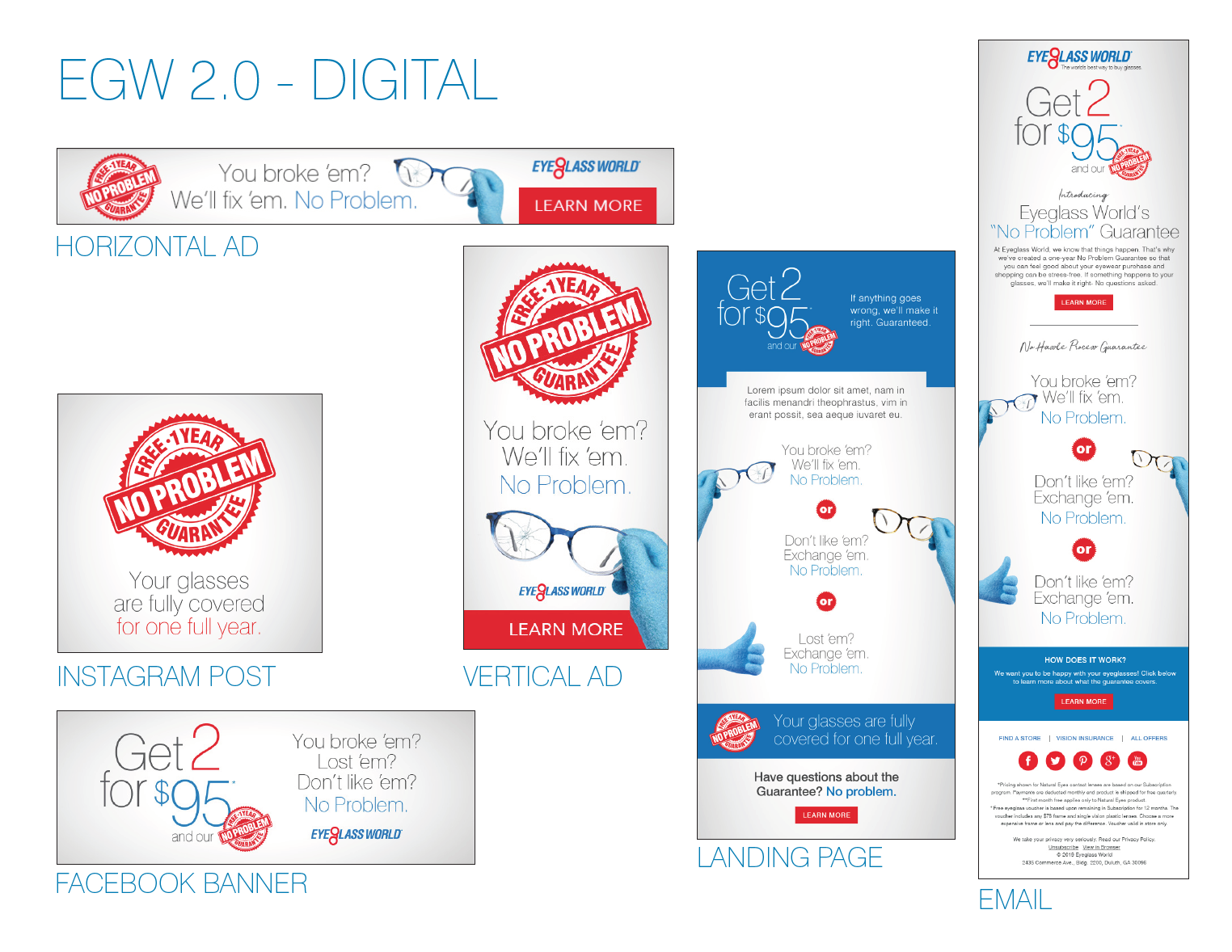 Eyeglass World is a retail chain specializing in eyewear and eye care services. It is one of the brands operated by National Vision, Inc. The Eyeglass World 2.0 No Problem Guarantee Ad Campaign was the last project that I worked on while employed at National Vision. This campaign was a huge deal to stakeholders, therefore we had several rounds of revisions before releasing it to our audience.