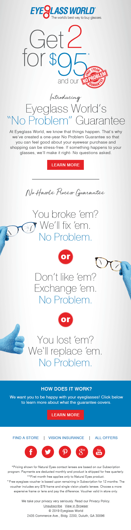 Eyeglass World launched the “No Problem Guarantee” to build trust and brand loyalty among higher-end customers who prefer designer frames like Ray-Ban, Nike, and Michael Kors. The offer: two pairs of glasses for $95, backed by a full year of no-hassle support, including free exchanges for lost, broken, or disliked frames.