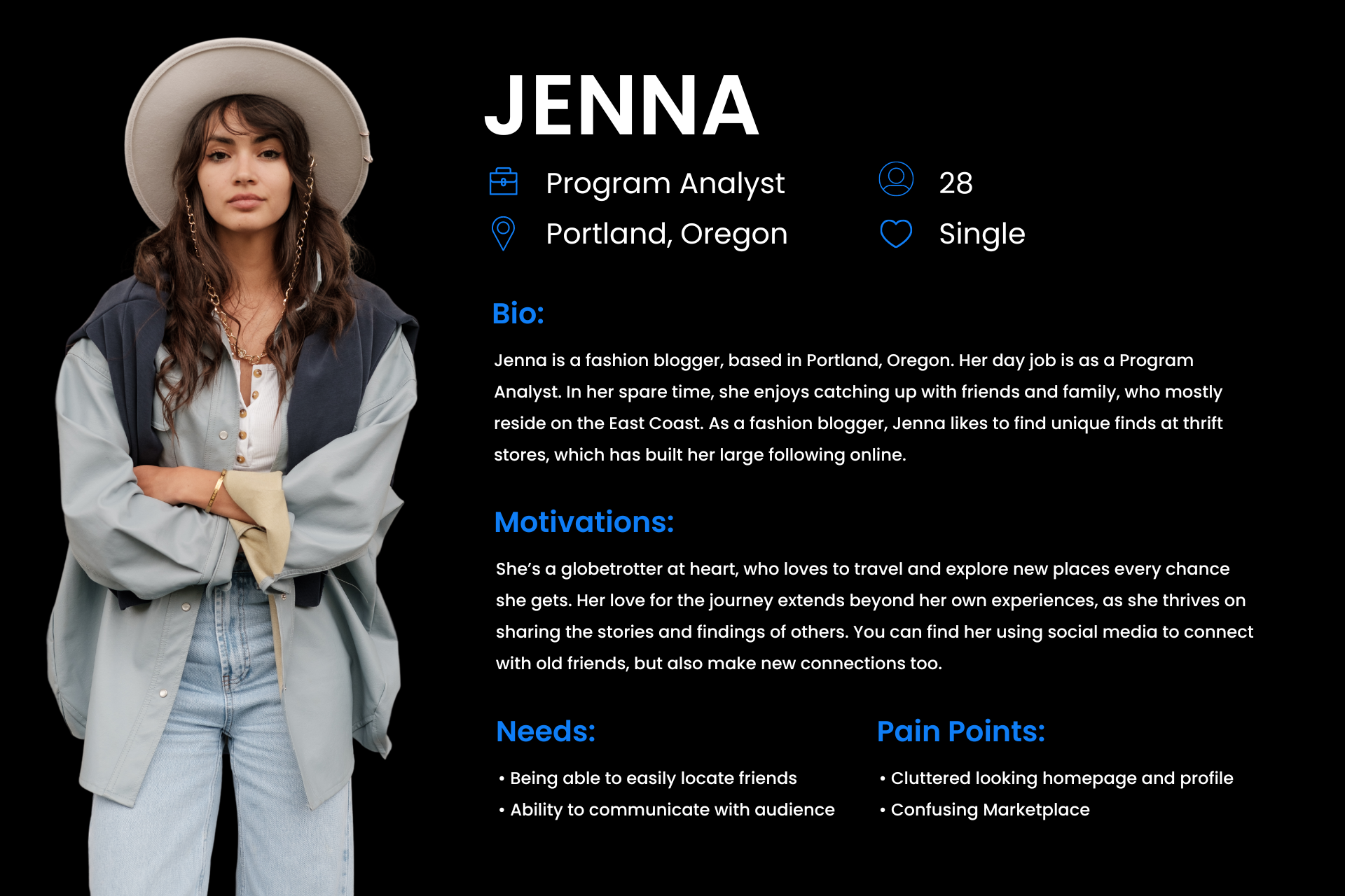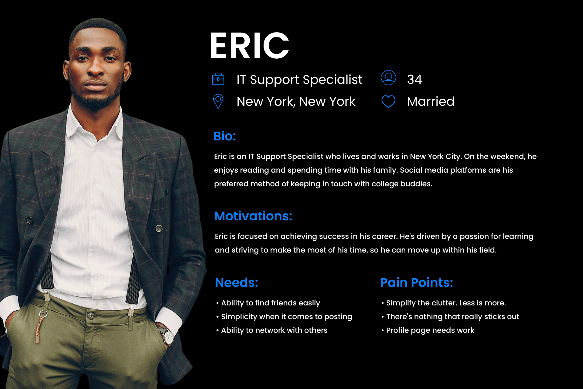 Based on my research and the feedback that I gathered from users, two distinct personas emerged based on their past experiences using Facebook. Our primary audience was those who look at social media as a way to stay in touch with family and friends.