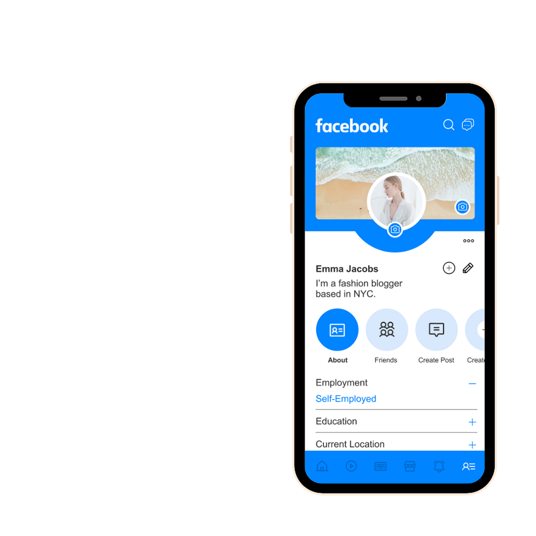 The original profile page is overwhelming and hard on the eyes. Less is more when it comes to design, and the current Facebook page has way too much going on. So, my approach to solving this issue is to organize every feature behind a circular button. This way, it’s clean and still easy to find what you love most about your profile page.