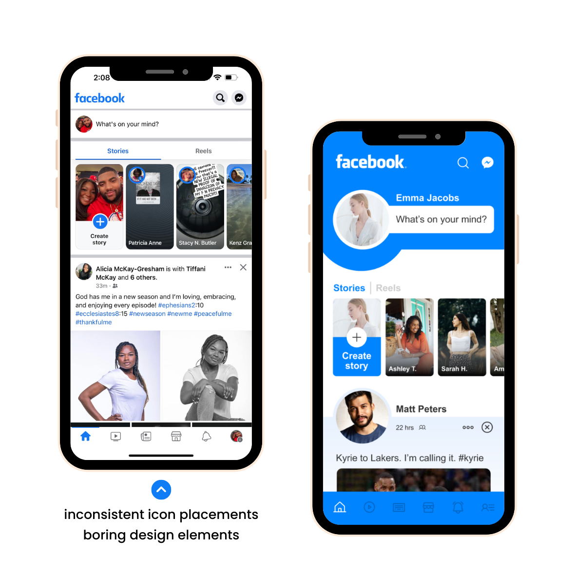 From the start of this project, there were clear signs of lack of consistent branding across Facebook’s platform. This includes both the general color scheme and logo visibility. Having a strong brand presence is important when developing an app. This motivated me to explore ways to increase its overall brand presence within the app.